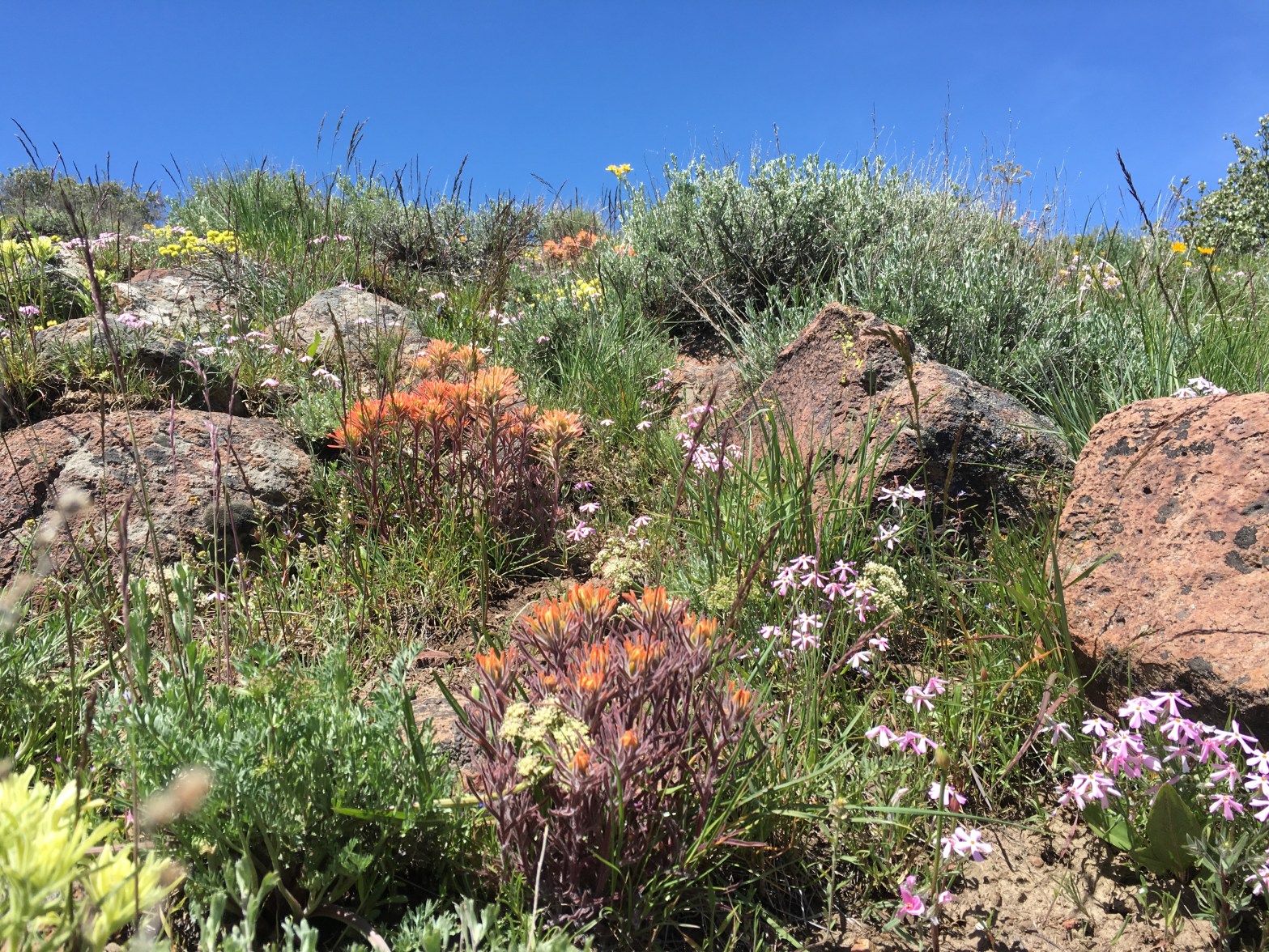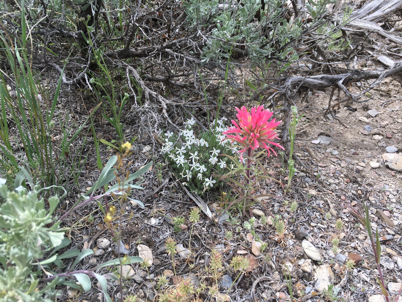 Linanthus pungens, granite prickly phlox; Castilleja angustifolia (?), narrow-leaf paintbrush; and Cryptantha glomerata; Goshute Valley, Elko County, Nevada, 19May2017.