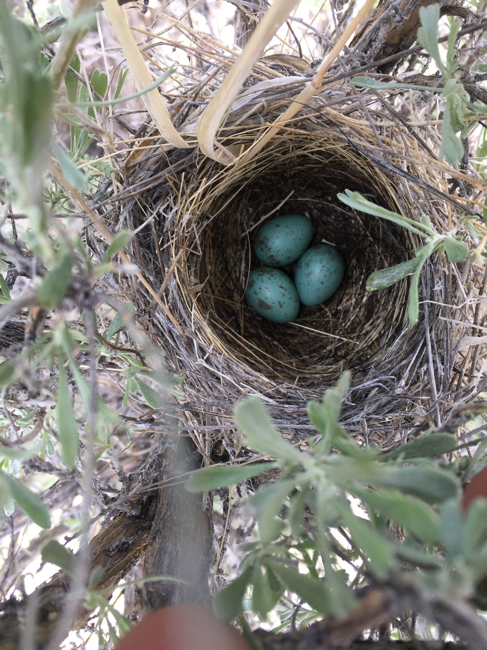Brewer’s sparrow eggs in Wyoming big sagebrush, Goshute Valley, Elko County, Nevada, 20May2017.